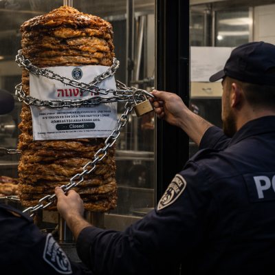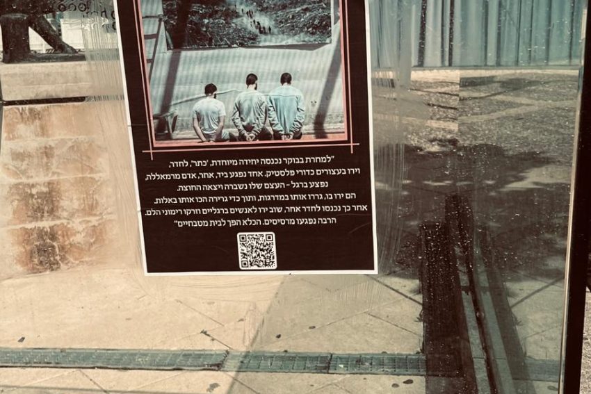 “מתקני הכליאה הישראליים מחנות עינויים.”זו הכותרת שנתלתה היום בשעה 11:00 בבוקר על שער הכניסה לאודיטוריום העירוני במרכז הכרמל. לא בשוליים ולא בחשכה אלא בלב העיר. כרזה שחורה אדומה בוהקת, דימוי אסירים כפותים בגבם אל הצופה, טקסט