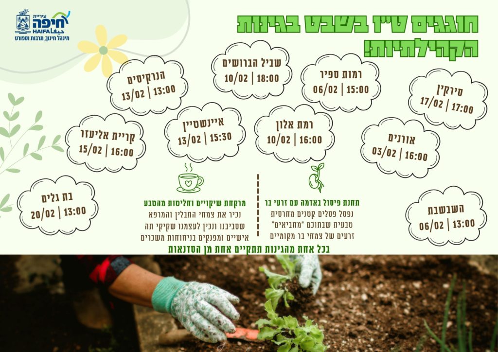 גם הגינות הקהילתיות ברחבי חיפה יציינו את החג במהלך חודש פברואר, עם סדנאות קיימות, פיסול באדמה, הכנת חליטות מצמחי תבלין ופעילויות גינון משותפות. לצדן יתקיימו עשרות אירועי קהילה בשכונות, במ