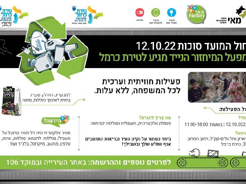 באירוע, שיתקיים בין בשעות 18:00-11:00, תיערך פעילות של מרכז המבקרים של מ.א.י פקטורי, מהמתקדמים והחדשניים בעולם למיחזור פסולת אלקטרונית וסוללות. בהפנינג ייהנו המשתתפים ממגוון סדנאות לילדים ולכל המשפחה, דוכני קיימות ואיכות סביבה, סדנת תיפוף סביבתי וקצבי על כלים מפסולת אלקטרונית, וכמובן מפעילות מפעל המיחזור הנייד של מ.א.י.