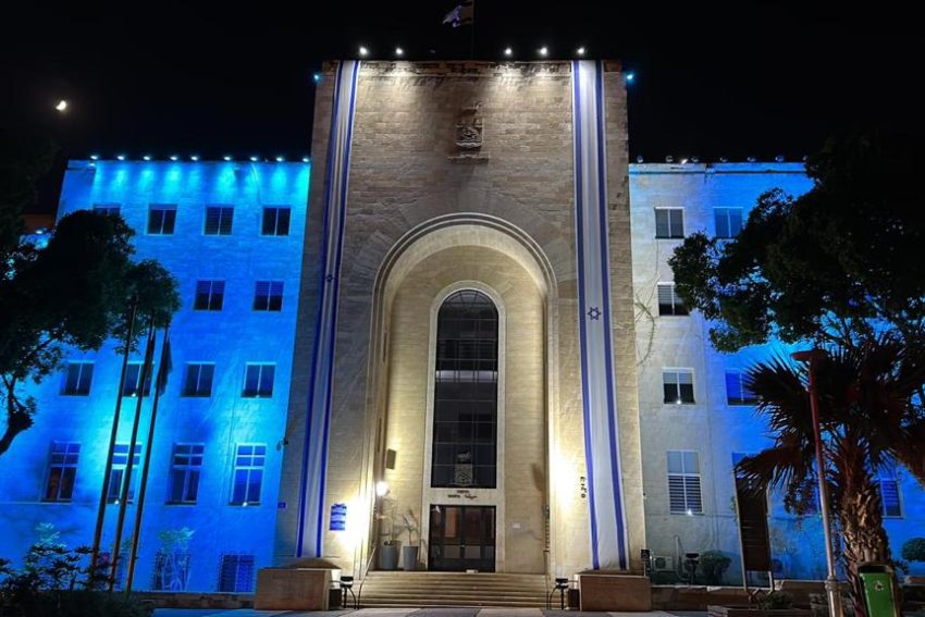 בניין עיריית חיפה יואר הערב בכחול-לבן במסגרת מיזם ארצי להוקרת פצועי ונכי צה"ל