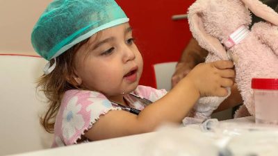 בובות שעברו בדיקות גופניות מקיפות, הסברים על צילום רנטגן בקופסת קרטון ובדיקת רופאה שצריכה קצת עזרה כדי לעלות על הכיסא – כך נראה בית